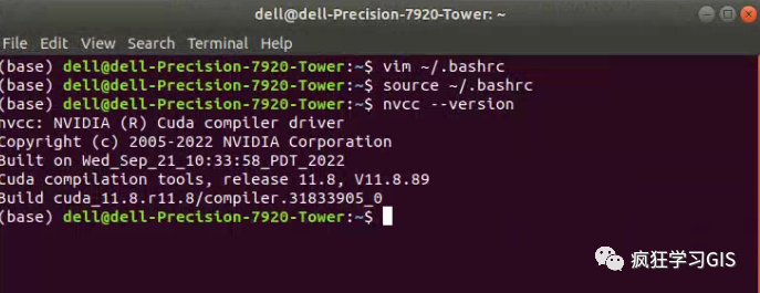 其中,第一句表示更新bashrc文件,使得我们刚刚修改的环境变量立即生效;第二句则是验证CUDA安装情况的代码。如果运行以上两句代码后,出现如下图所示的界面,则表明我们的CUDA配置与环境变量配置都已经完成。