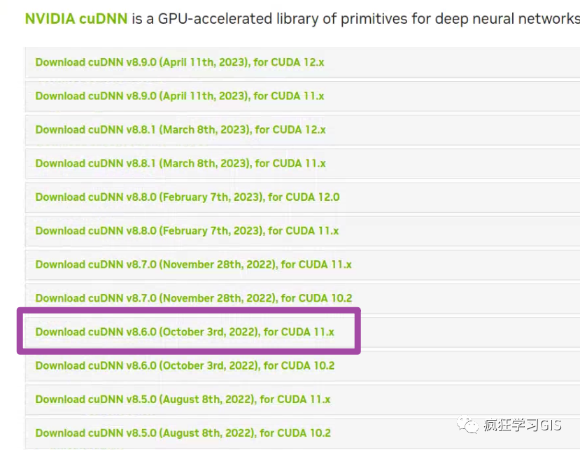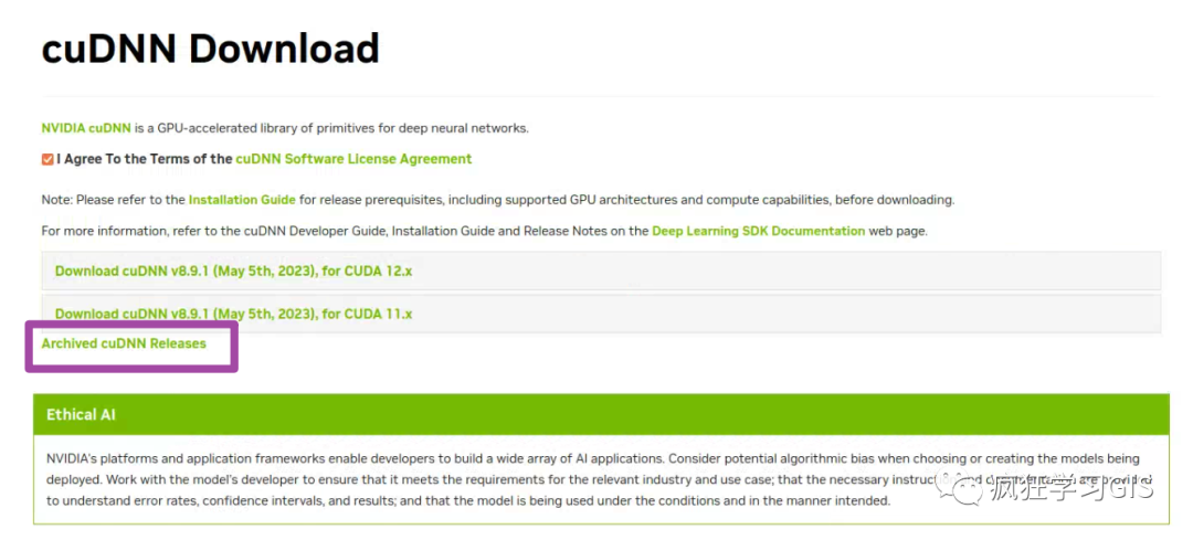 随后,我们在网站中找到对应版本的cuDNN。这里需要注意,如果我们需要的cuDNN版本并不是最新的,那么就需要在下图中“Archived cuDNN Releases”选项中找到老版本。