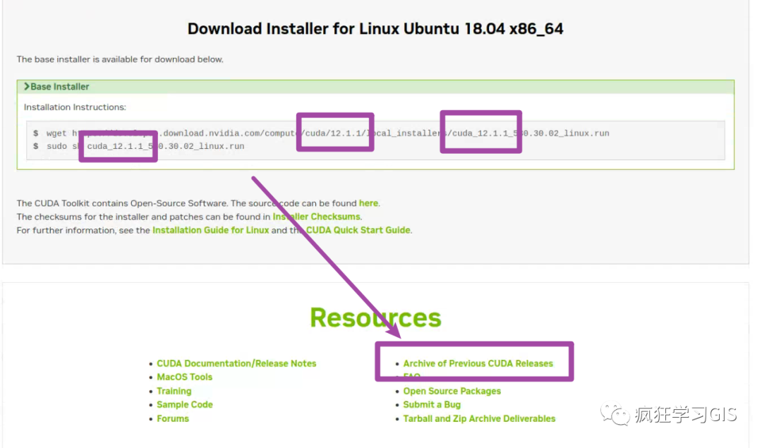 随后,网站将根据我们的选择,自动展示最新版本的CUDA。但是要注意,网站中给我们的选择,默认是最新的版本,而我们需要根据前文提到的tensorflow库版本与对应的CUDA、cuDNN版本匹配表格,确定我们需要的版本。例如,如下图前3个紫色框所示,网站中给出的CUDA版本是12.1.1的,而我需要的版本是11.8的,因此就需要通过下图中“Archive of Previous CUDA Releases”选项,找到老版本的CUDA。