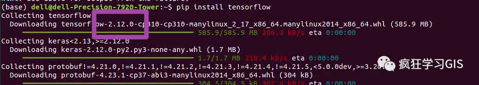 运行上述代码,我们将自动开始安装当前环境(也就是Python版本)支持的最新版本的tensorflow库;如下图所示。