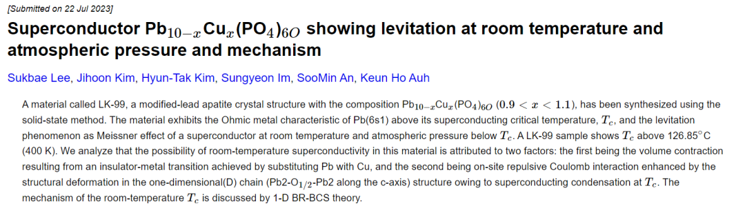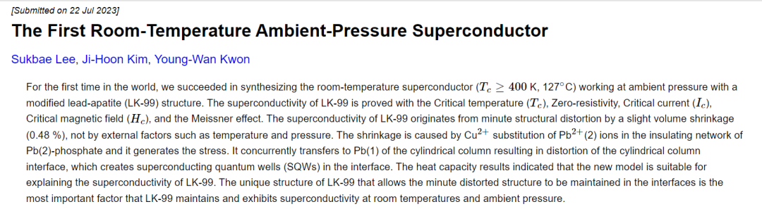 不过这次,事情看上去有点不同寻常。这份研究来自韩国的一个团队。他们在 arXiv 上上传了两篇论文,宣称他们合成了一种常压下的室温超导材料,其超导临界温度超过了水的沸点,最高达到 127 摄氏度。
