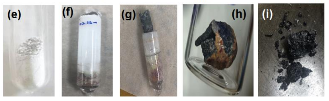 文章给出了第三步过程中的照片:e 是反应前的混合粉末, f 是反应后还密封着的样品,g 是样品取出时的样子,h 和 i 是得到的样品的照片。
