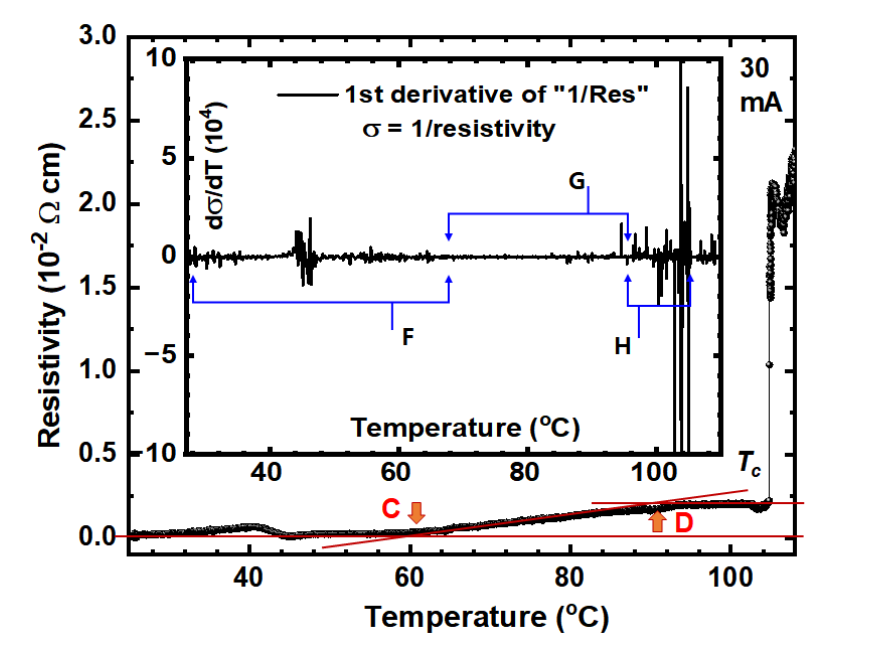 他们在 30 毫安的电流下,采用四探针法对样品 2 进行了电阻测量,结果发现,在 105 摄氏度左右,电阻有一个明显的跳变,他们认为此时发生了超导转变。