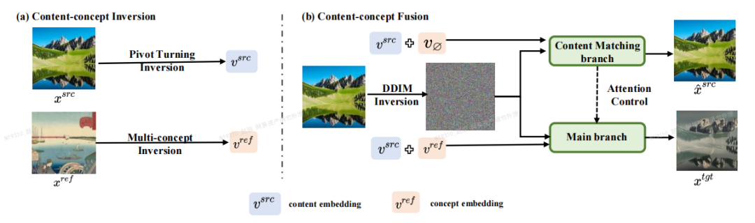 在扩散模型的每一步,特征向量的融合都发生在噪声空间空间,是特征向量输入扩散模型之后预测的噪声的加权。内容重建分支的特征混合发生在内容特征向量