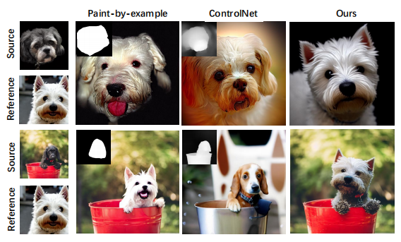 (3)不需要额外信息:相较于近期的一些需要添加额外控制信息(如:遮罩图或深度图)等方案来进行引导控制的方案,VCT 直接从源图像和参考图像学习结构信息和语义信息来进行融合生成,下图是一些对比结果。其中,Paint-by-example 通过提供一个源图像的遮罩图,来将对应的物体换成参考图的物体;Controlnet 通过线稿图、深度图等控制生成的结果;而 VCT 则直接从源图像和参考图像,学习结构信息和内容信息融合成目标图像,不需要额外的限制。