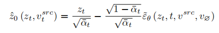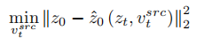 为了复原源图片,文章参考 NULL-text【5】优化的方案,学习 T 个阶段的特征向量去匹配拟合源图像。但与 NULL-text 优化空文本向量去拟合 DDIM 路径不同的是,本文通过优化源图片特征向量,去直接拟合估计的干净特征向量,拟合公式为: