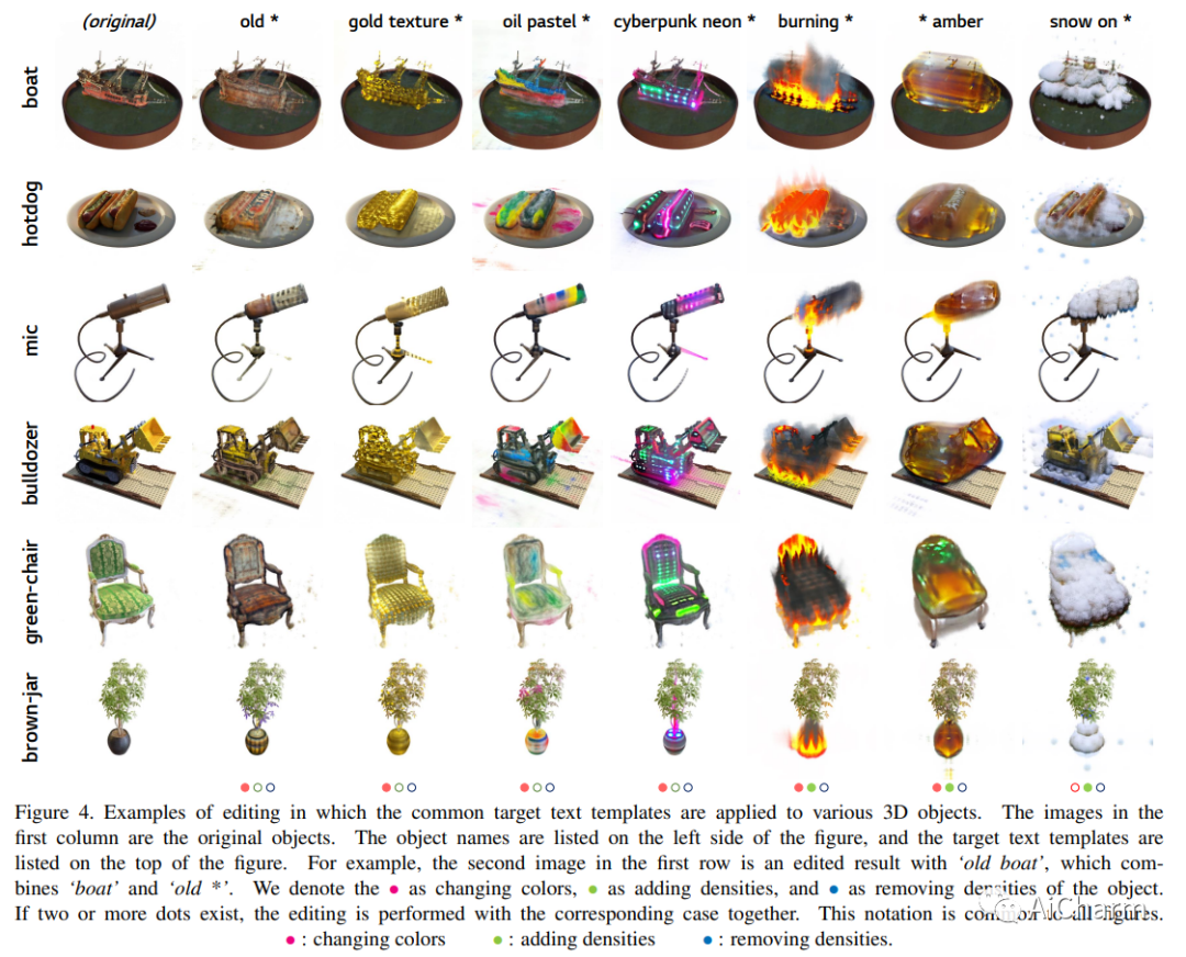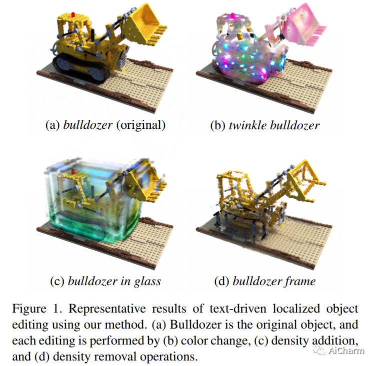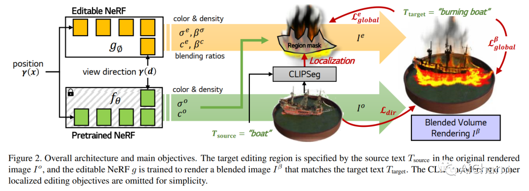 文本驱动的 3D 对象本地化编辑特别困难,因为在不扭曲对象形式的情况下将原始 3D 对象与预期的新对象和样式效果进行本地混合并不是一个简单的过程。为了解决这个问题,我们提出了一种新的基于 NeRF 的模型 Blending-NeRF,它由两个 NeRF 网络组成:预训练的 NeRF 和可编辑的 NeRF。此外,我们引入了新的混合操作,使 Blending-NeRF 能够正确编辑由文本本地化的目标区域。通过使用预训练的视觉语言对齐模型 CLIP,我们指导 Blending-NeRF 添加具有不同颜色和密度的新对象、修改纹理并删除原始对象的部分内容。我们广泛的实验表明,Blending-NeRF 可根据各种文本提示生成自然且本地编辑的 3D 对象。