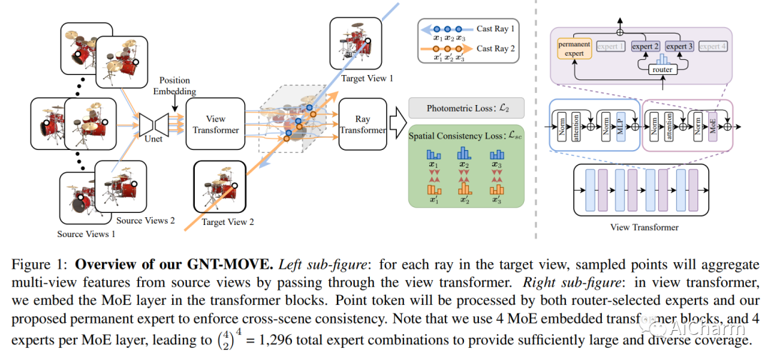 跨场景可推广的 NeRF 模型可以直接合成未见过的场景的新颖视图,已成为 NeRF 领域的新亮点。一些现有的尝试依赖于日益端到端的“神经化”架构,即用高性能神经网络(例如变压器)替换场景表示和/或渲染模块,并将新颖的视图合成转变为前馈推理管道。虽然这些前馈“神经化”架构仍然不能很好地适应不同的场景,但我们建议将它们与来自大型语言模型(LLM)的强大的专家混合(MoE)思想联系起来,该思想已经表现出了卓越的泛化能力通过在更大的整体模型容量和灵活的每个实例专业化之间进行平衡。从最近的通用 NeRF 架构(称为 GNT)开始,我们首先证明 MoE 可以巧妙地插入以增强模型。我们进一步定制了一个共享的永久专家和一个几何感知的一致性损失,以分别增强跨场景一致性和空间平滑度,这对于可概括的视图合成至关重要。我们提出的模型被称为 GNT with Mixture-of-View-Experts (GNT-MOVE),它在转移到未见过的场景时通过实验显示了最先进的结果,表明在零样本和少拍设置。