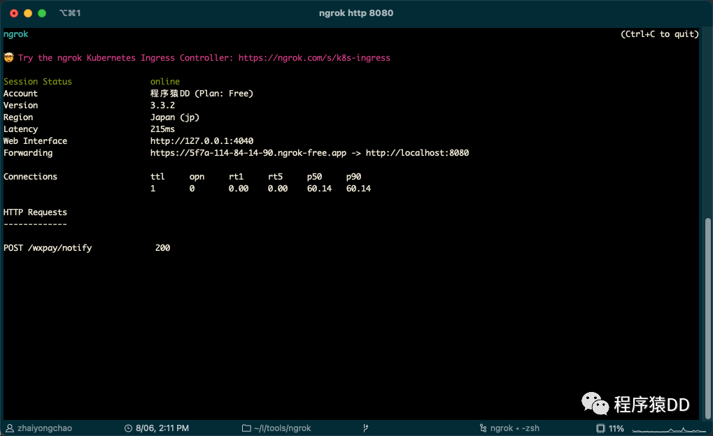 这里要关注一下其中的Forwarding内容,后面的域名就是用来通过公网访问您本地8080端口应用接口的地址了。