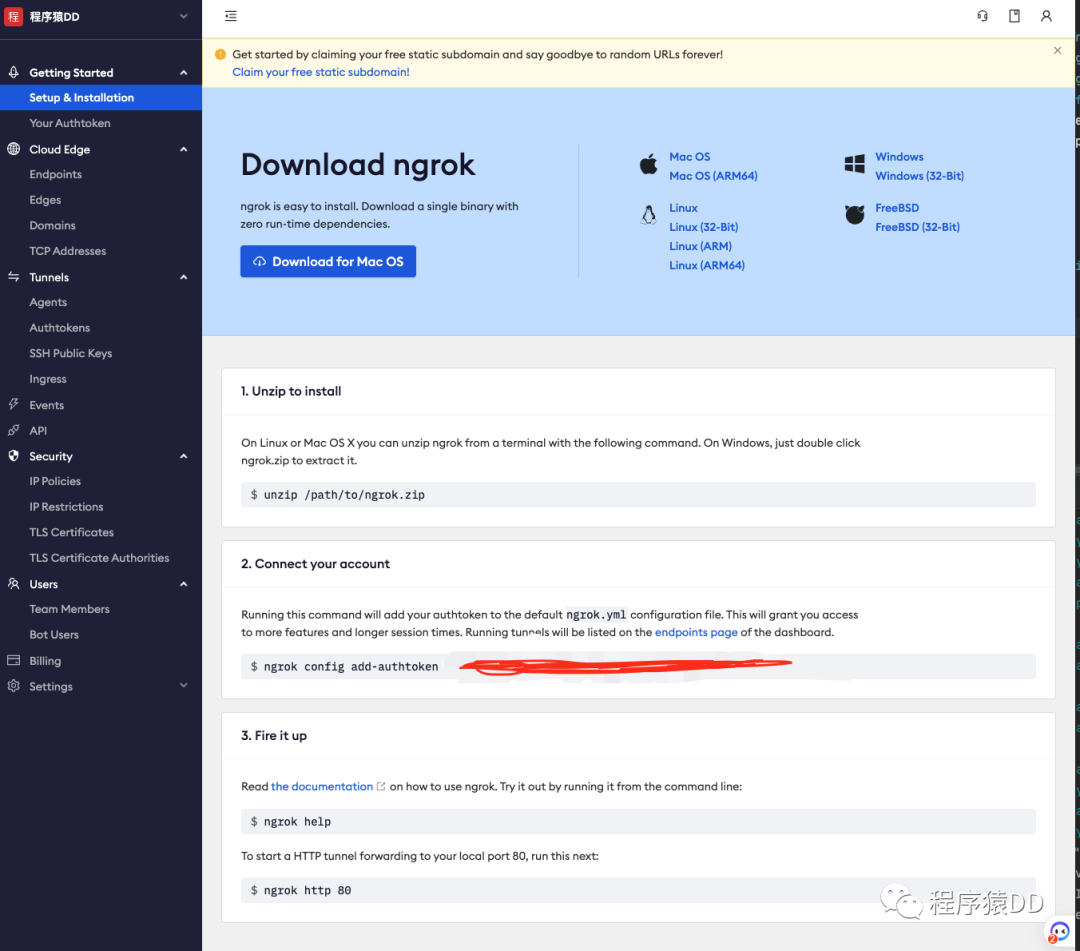 直接复制Dashboard中第二步的ngrok config add-authtoken xxxxx命令,然后打开终端,定位到之前解压ngrok的位置执行它!
