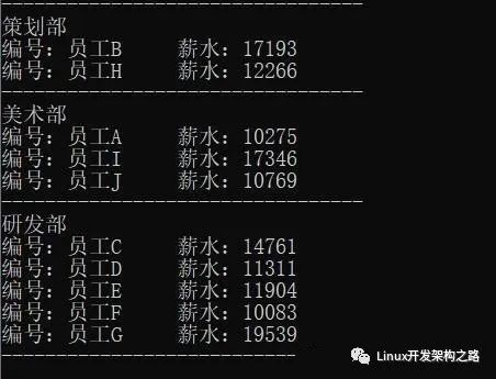 公司今天招聘了10个员工(ABCDEFGHIJ),在进入公司后,要随机给他们分配部门和工资(背景设定,不符合现实),员工的信息有姓名,工资,和所属部门,部门有三个种类,分别是策划部、美术部和研发部,现在要求分部门显示员工的所有信息。