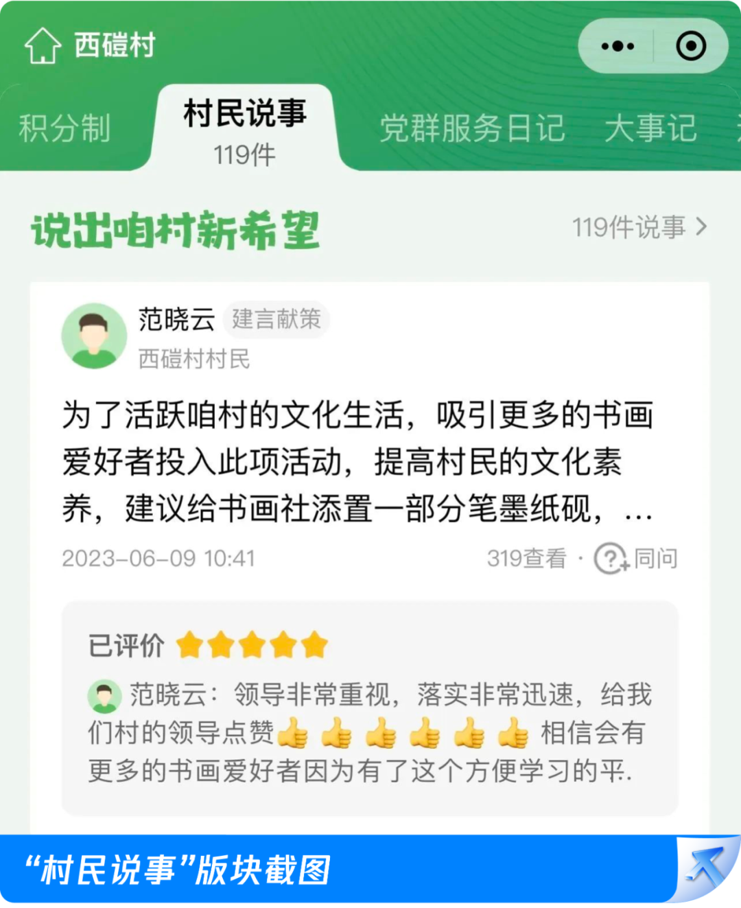 现在,“村民说事”功能上线近一年后,已在全平台积累了2.76万件议事。每件小事,都能快速得到回应。