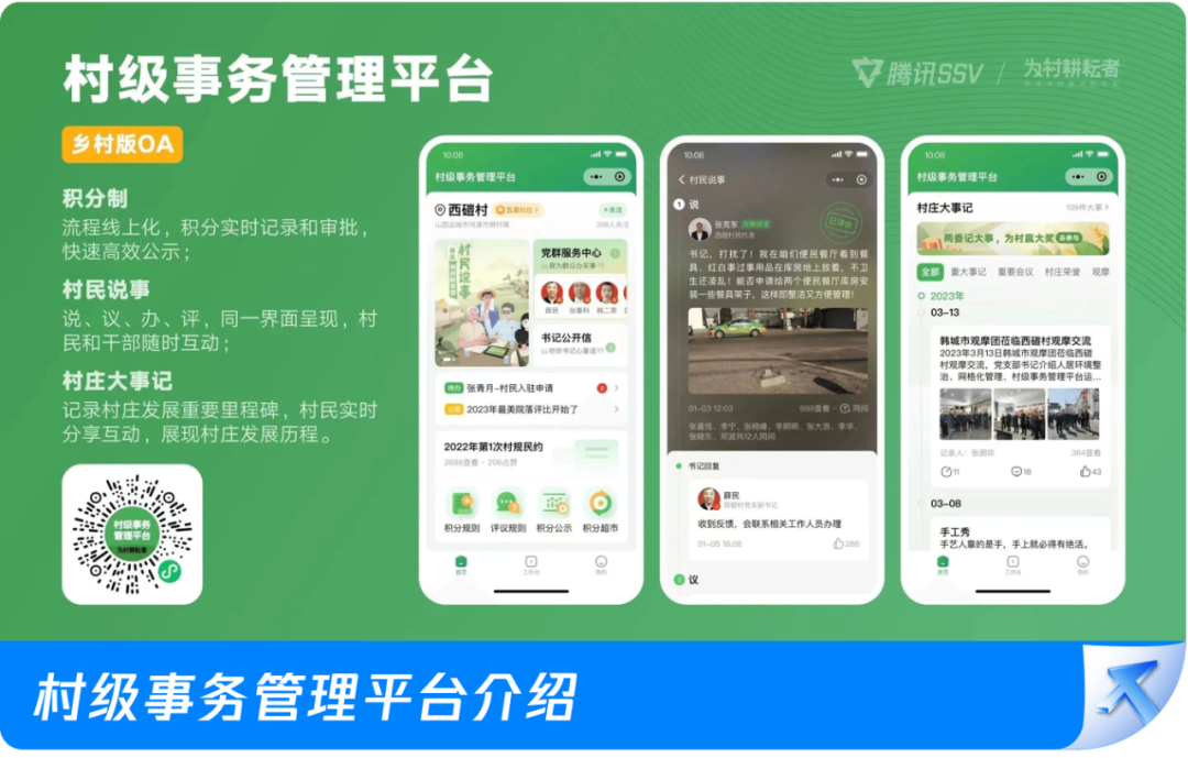 比如,在“村级事务管理平台”小程序上,新增加了一个“村民说事”的功能版块。村民有事,可以直接在上面反馈,能很快得到村干部的回应。