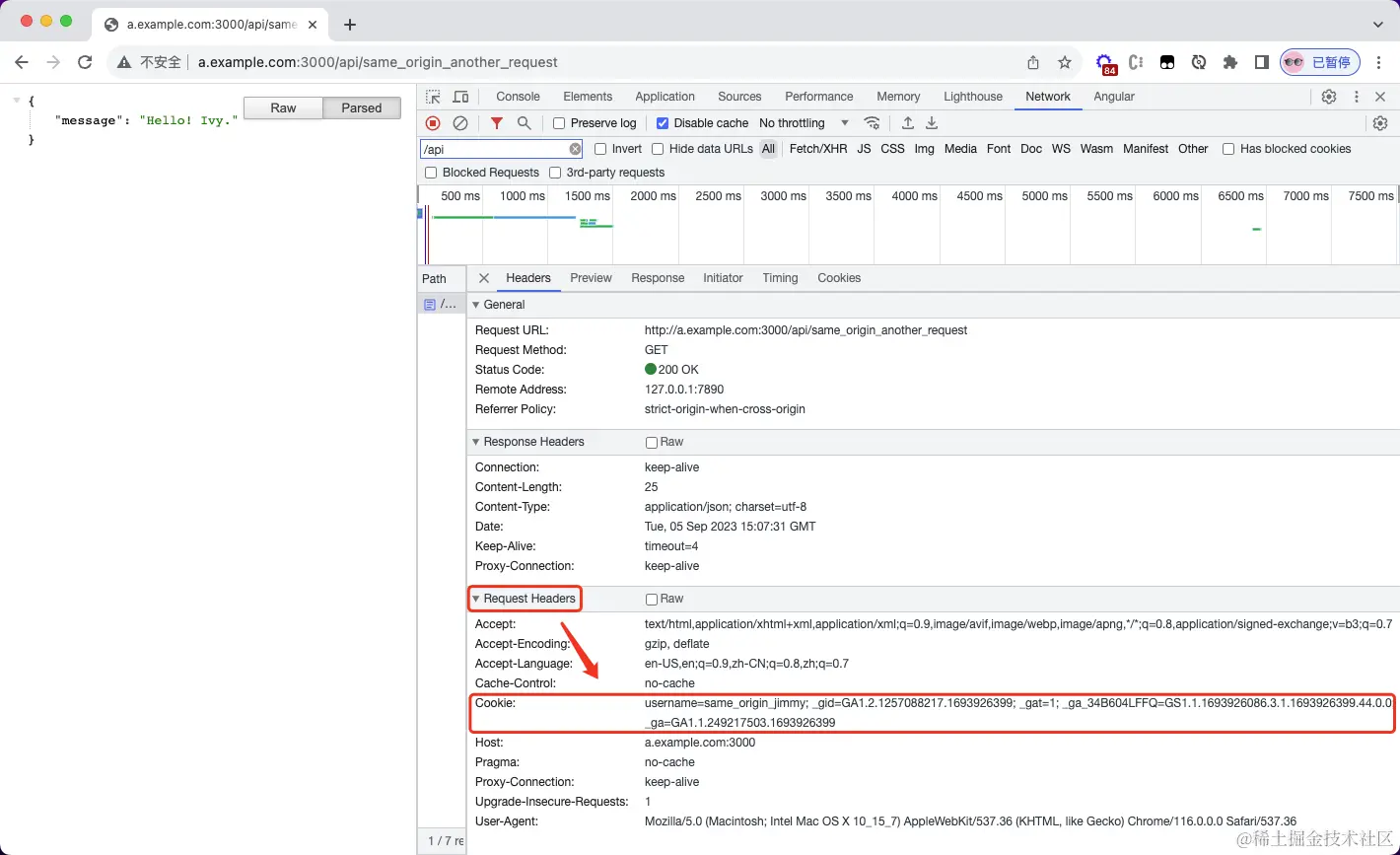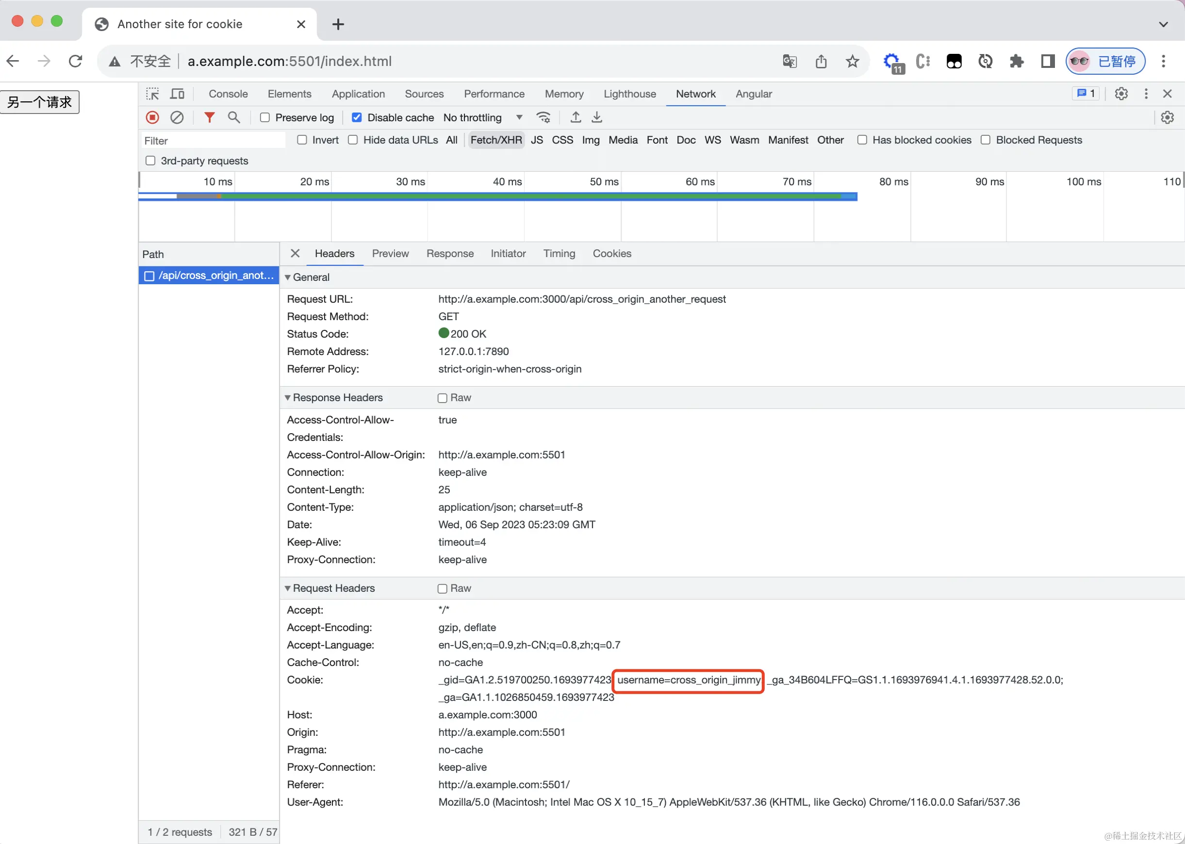 好了,我们简单了解了 cookie 的相关参数说明。我们现在通过浏览器打开同源网站的另一个 url 请求 - http://a.example.com:3000/api/same_origin_another_request。这个时候,应该在 Request Headers 中带上 cookie 属性才对。验证如下图:
