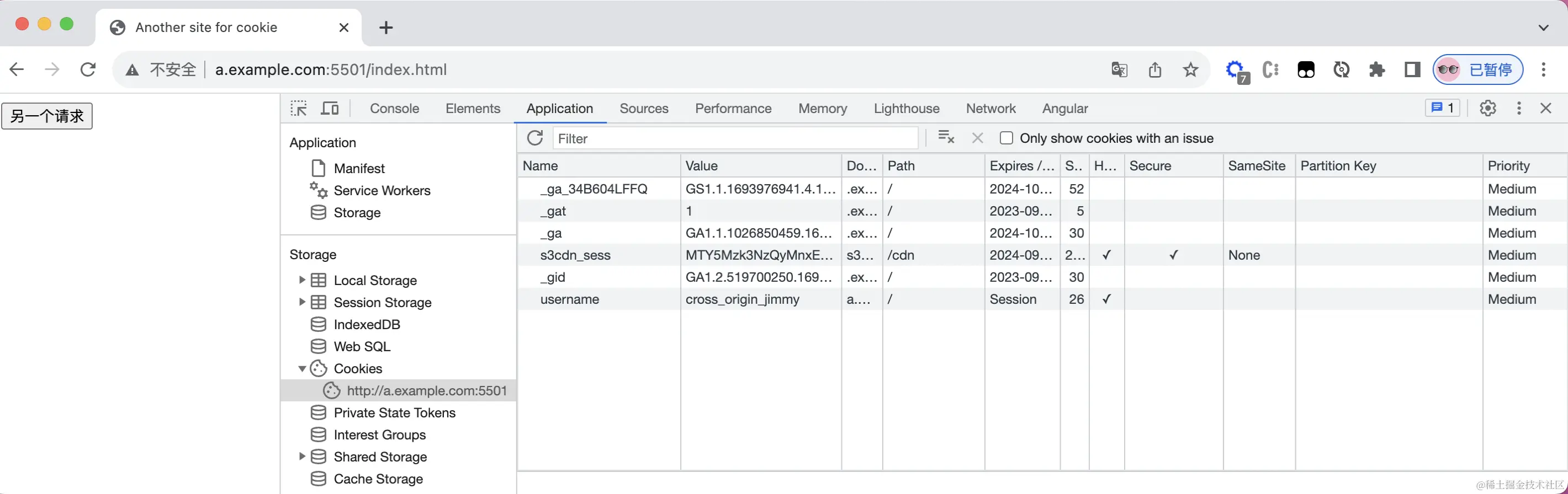 </html>当我们自动打开该网页 http://a.example.com:5501/,在 Application -> Cookies -> http://a.example.com:5501 下看到写入的 cookie 信息。如下图: