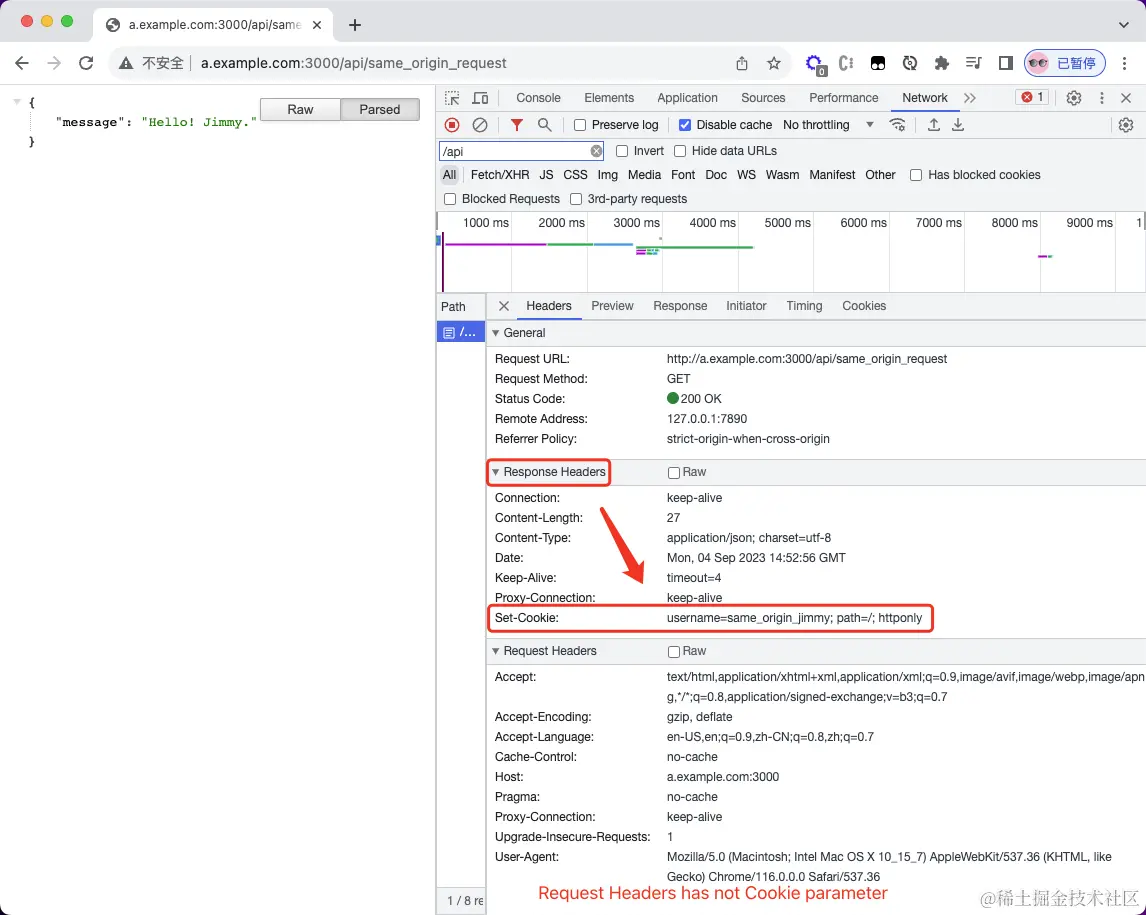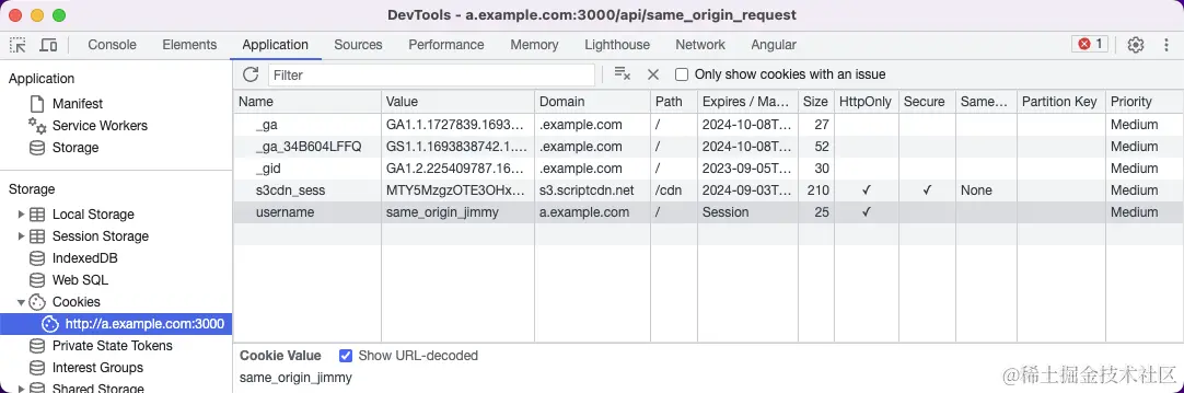 此时 cookie 信息会自动写入 username=same_origin_jimmy。我们通过面板 Application -> Cookies -> http://a.example.com:3000 查看到相关 cookie 信息: