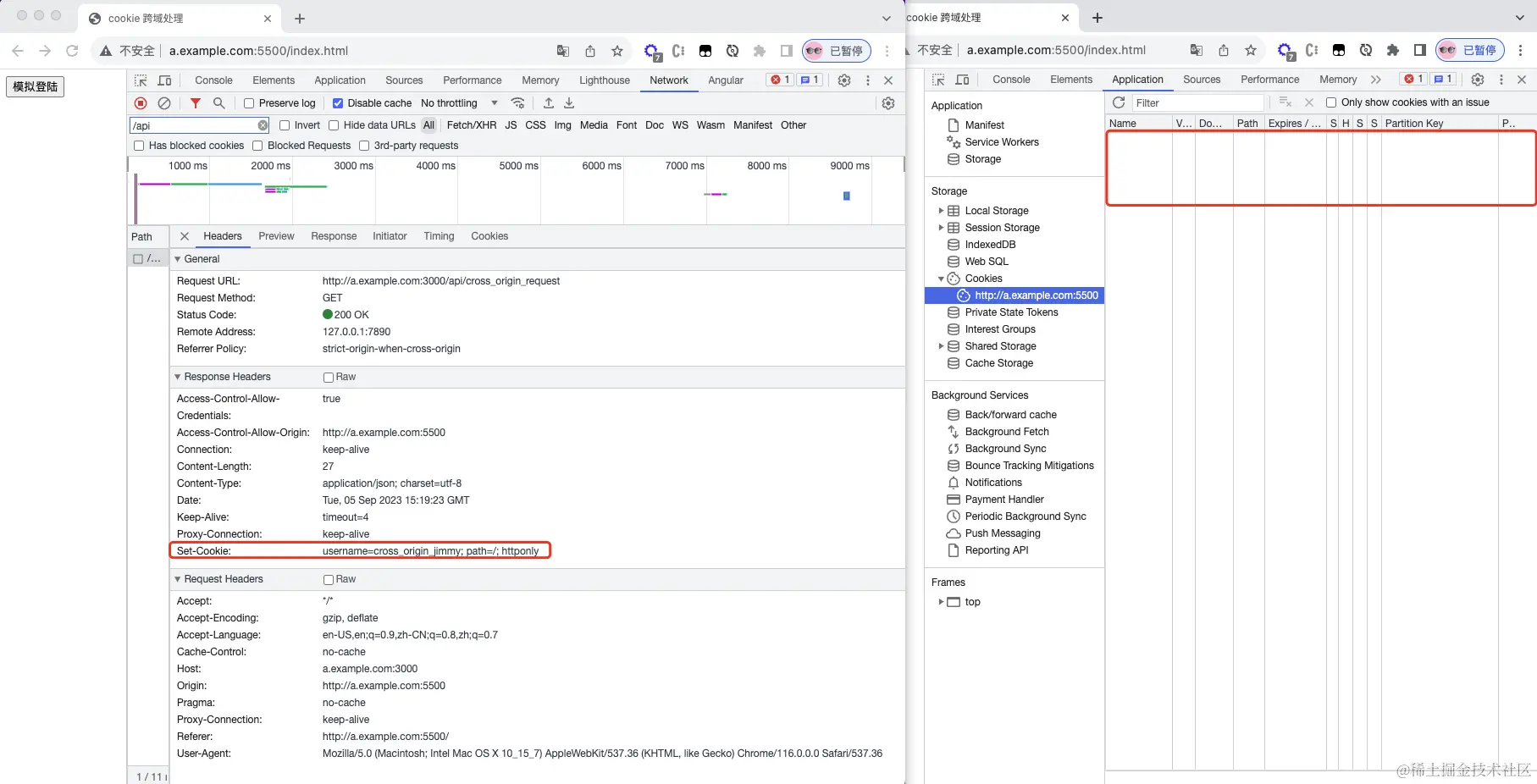 })上面代码中,我们通过 http://a.example.com:5500/api/cross_origin_request 接口模拟了用户登陆并设置了允许跨域中携带凭证 Access-Control-Allow-Credentials,然后设置了返回的 cookie 信息。