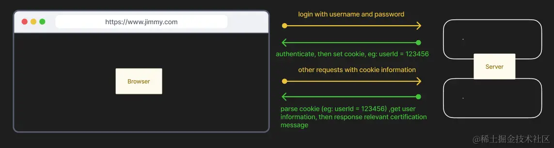 浏览器会存储 Cookie 并在下一次向同一个服务器再发起请求时携带并发送到服务器上。 Cookie 通过用户的浏览器在服务器和浏览器之间传递。