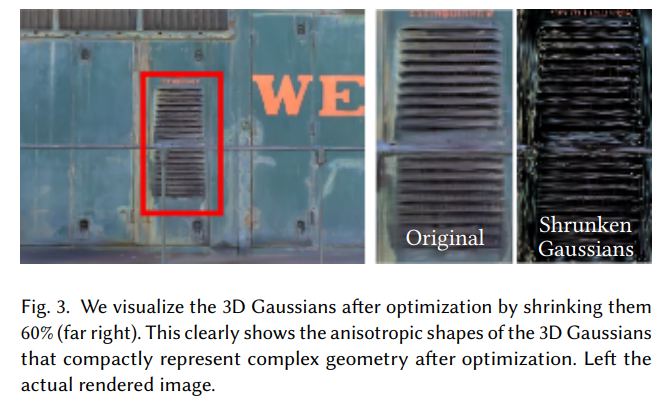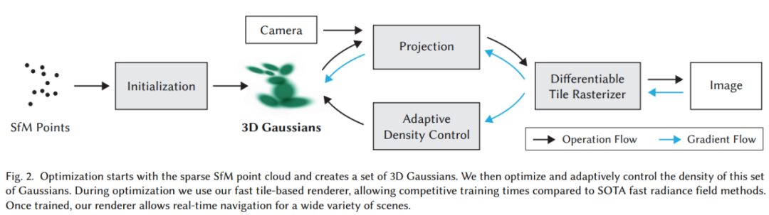 第二,优化 3D 高斯属性,即 3D 位置、不透明度𝛼、各向异性协方差和球谐波(SH)系数。优化过程产生了一个相当紧凑、非结构化和精确的场景表征。