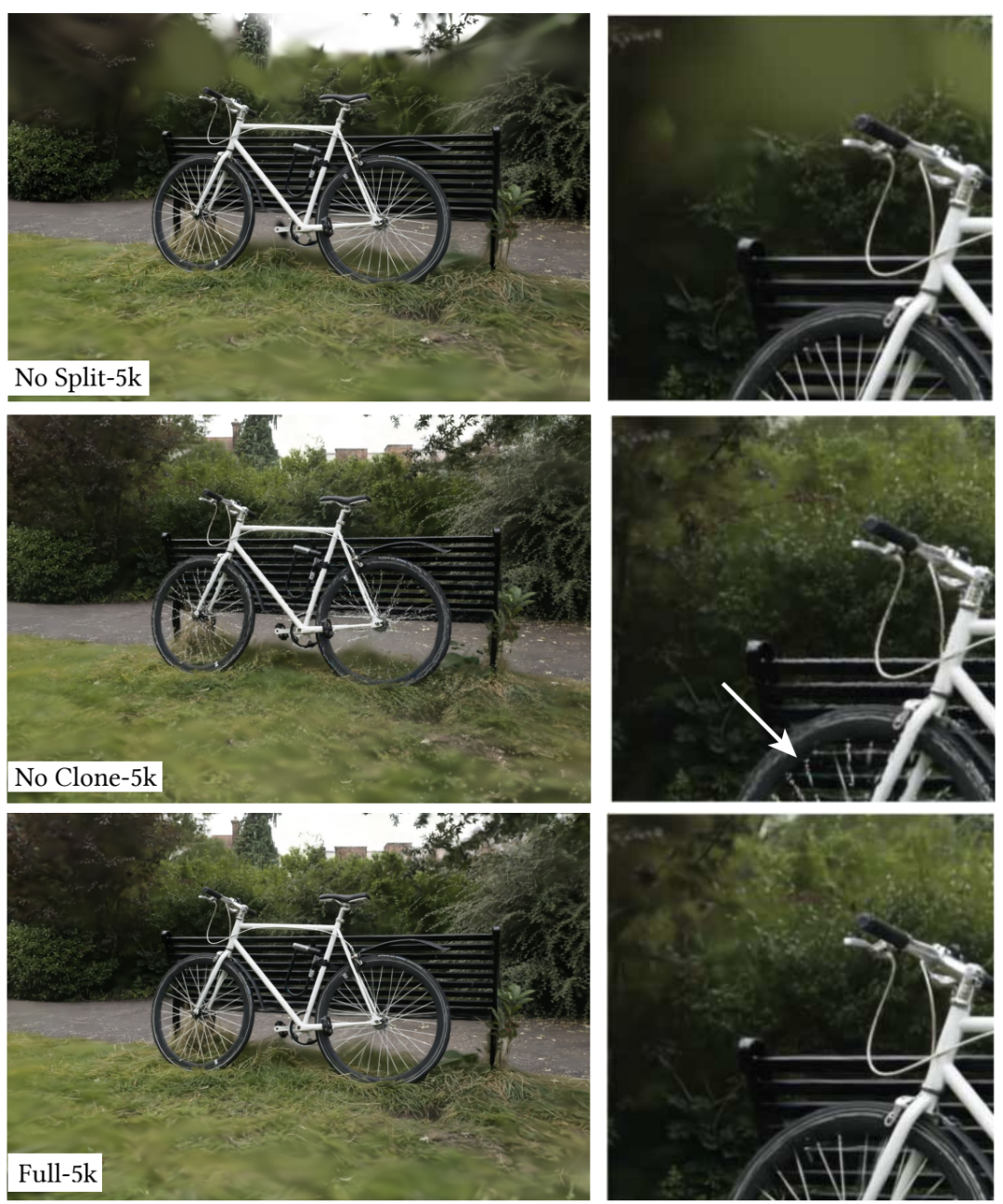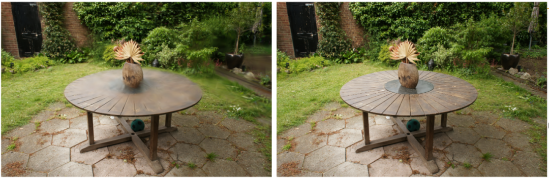 限制接受渐变的点的数量,对视觉质量影响是显著的。左图:限制接收梯度的 10 个高斯点。右图:本文的完整方法。