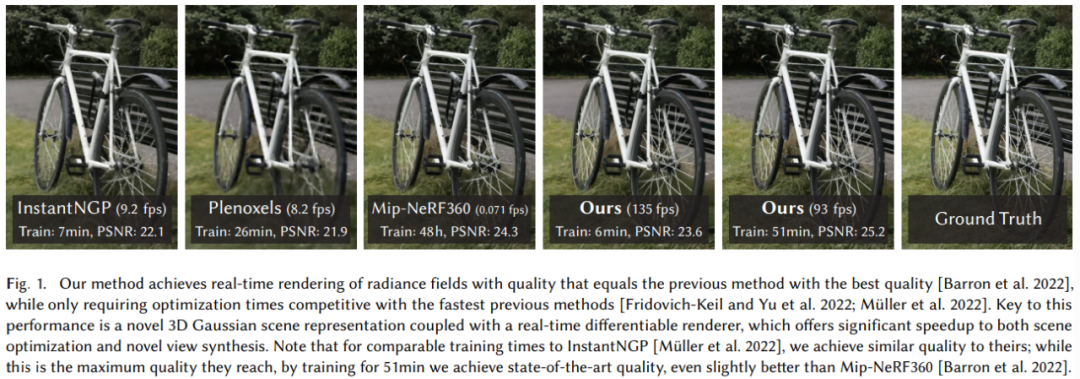 研究团队立下目标:对多张照片拍摄的场景进行实时渲染,并在典型真实场景中实现时间最优化。此前,Fridovich-Kei 等人提出的方法虽然实现了快速训练,但难以达到当前 SOTA NeRF 方法所获得的视觉质量,而后者需要长达 48 小时的训练时间。还有研究提出快速但质量较低的辐射场方法,可以根据场景实现交互式渲染(每秒 10-15 帧),但这种方法无法实现高分辨率下的实时渲染。