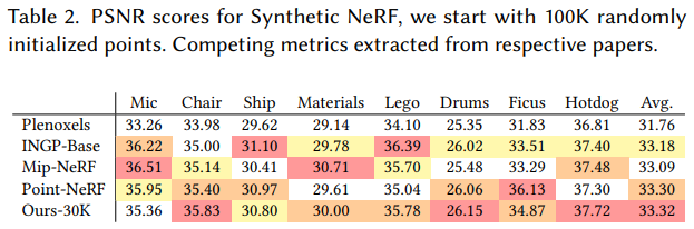 合成 NeRF 的 PSNR 分数。可以看到本文方法在多数情况下分数都较好,甚至达到最优。