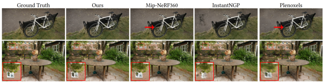 场景自上而下依次为来自 Mip-NeRF360 数据集的自行车、花园、柜台和房间;来自深度混合数据集的游戏室(更多对比请阅读原文)。图中把不同方法产生的显著差异已经标出,如自行车的辐条、花园远处的房屋玻璃、铁篮子的杆子以及玩具小熊。