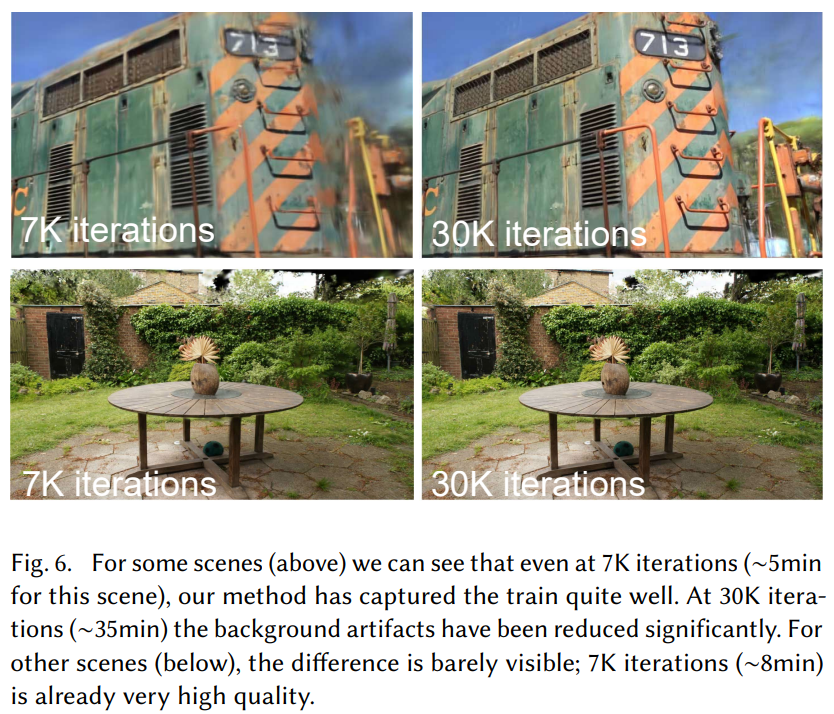 除此之外,在图 6 中我们可以看到,即使迭代 7K 次(∼ 5 分钟),本文方法也能很好地捕捉列车的细节。在迭代 30K 次(∼35 分钟)时,背景伪影明显减少。对于花园场景,差异几乎不明显,7K 次迭代(∼8 分钟)已经是非常高的质量了。