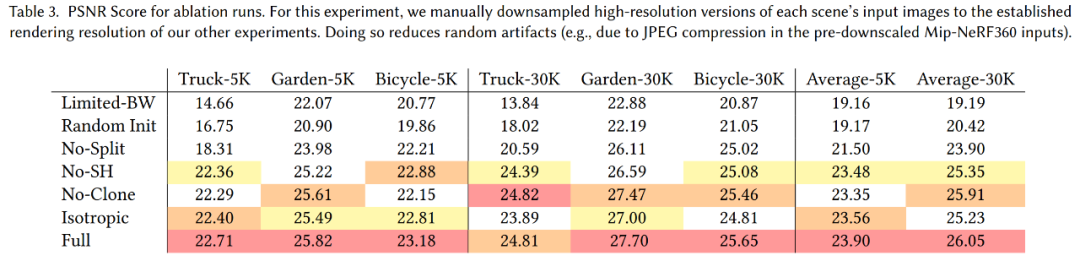 研究团队将所做的不同贡献和算法选择分离出来,并构建了一组实验来衡量它们的效果。对算法的以下几个方面进行了测试:从 SfM 初始化、致密化策略、各向异性协方差、允许无限数量的斑块具有梯度以及球谐波的使用。下表总结了每种选择的定量效果。