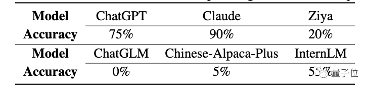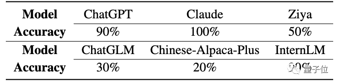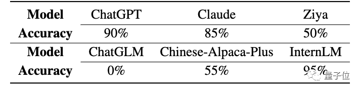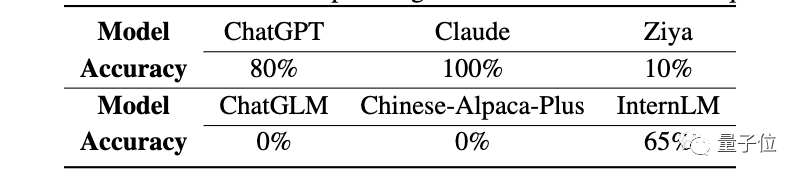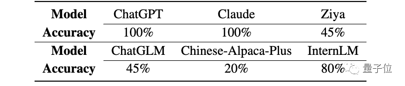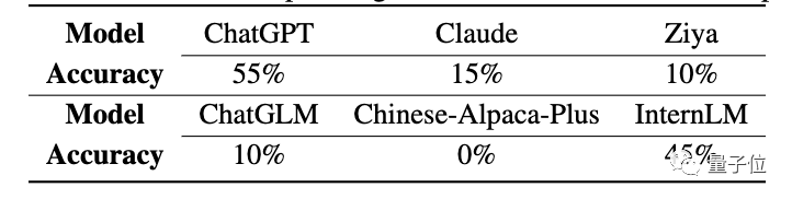 结果各个LLM的正确率显著下降,ChatGPT从100%下降到55%,Claude从100%下降到15%,InternLM超过Claude,仅次于ChatGPT。