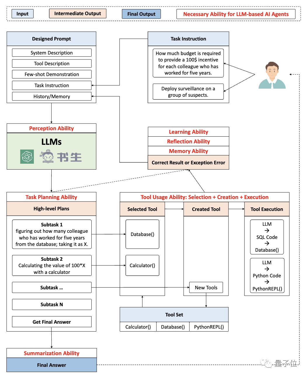 要知道,要想增强或取代实际应用中的人工决策,除了任务规划和使用工具的能力,AI智能体通常还需要感知能力、学习/反思/记忆能力、总结能力。