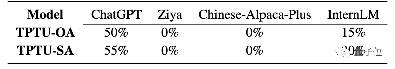 由于基于用户界面的LLM缺乏调用外部工具的能力,所以这部分仅使用四个基于API的LLM来做评估:ChatGPT,Ziya,Chinese-Alpaca和InternLM。