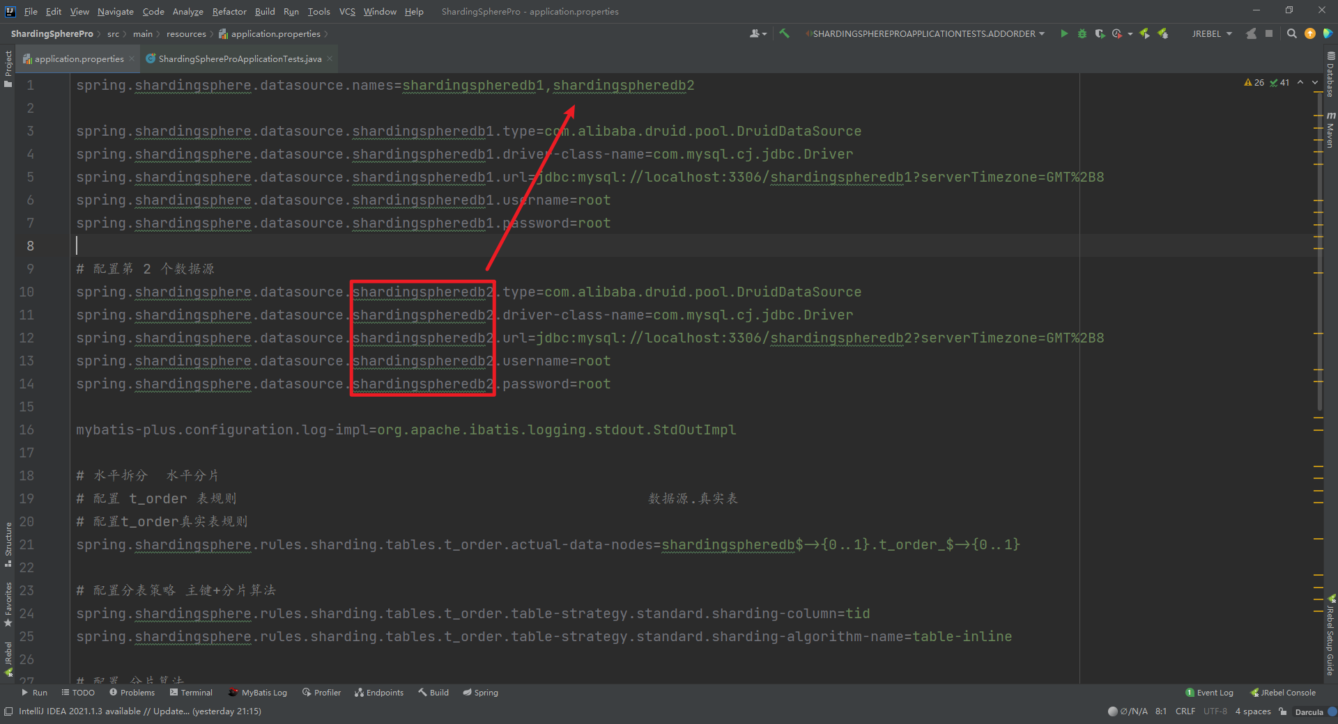 mybatis-plus.configuration.log-impl=org.apache.ibatis.logging.stdout.StdOutImpl需要注意的是如上配置的 shardingspheredb1 它代表着一个 databases 也就是一个数据源,那么下面的配置也要跟着改: