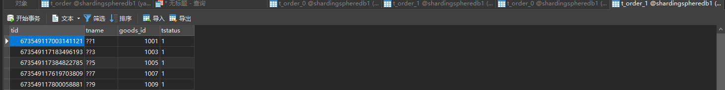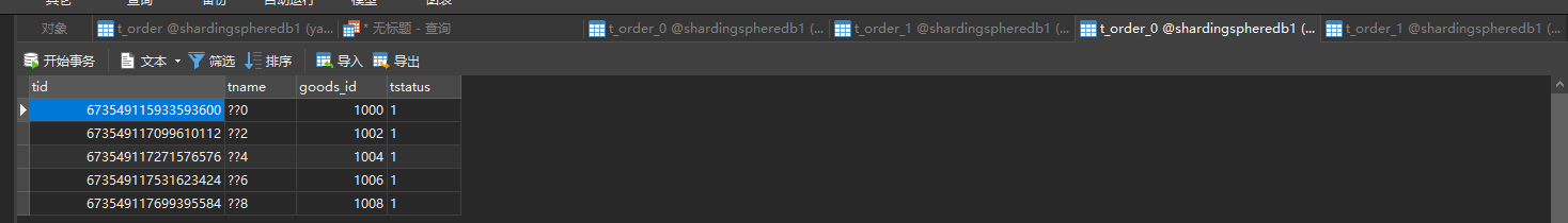 spring.shardingsphere.props.sql-show=truespring.shardingsphere.rules.sharding.tables.t\_order.actual-data-nodes 该内容就是配置 t\_order 真实表规则, 我如上配置的就是 0,1spring.shardingsphere.rules.sharding.sharding-algorithms.table-inline.props.algorithm-expression 配置的内容就是真实表的寻找算法spring.shardingsphere.rules.sharding.tables.t\_order.table-strategy.standard.sharding-column 指定了分表以 tid 进行分表操作如上的内容配置完毕之后再次运行测试类,在运行测试类之前其实可以将 id 的设置给去除因为如上配置了 主键盘生成策略,然后查看分片表的数据如下图所示: