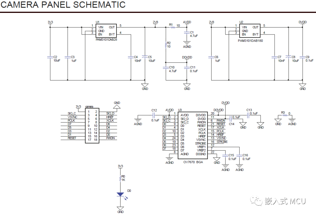 其中摄像头OV7670典型的硬件供电连接图参考如下:
