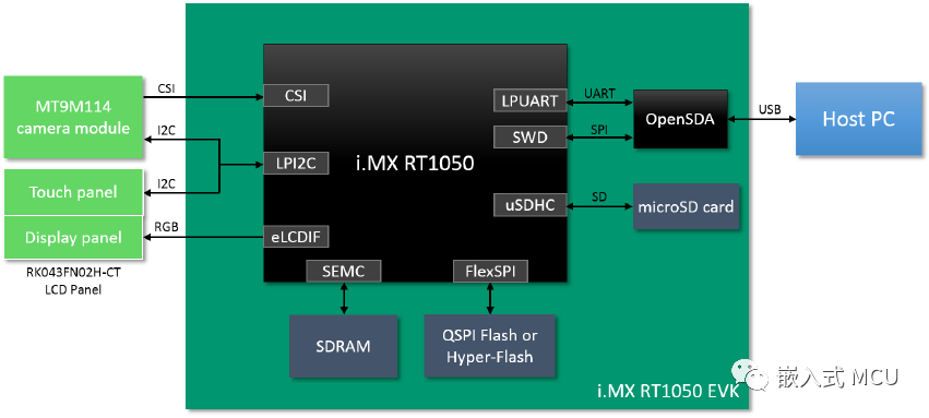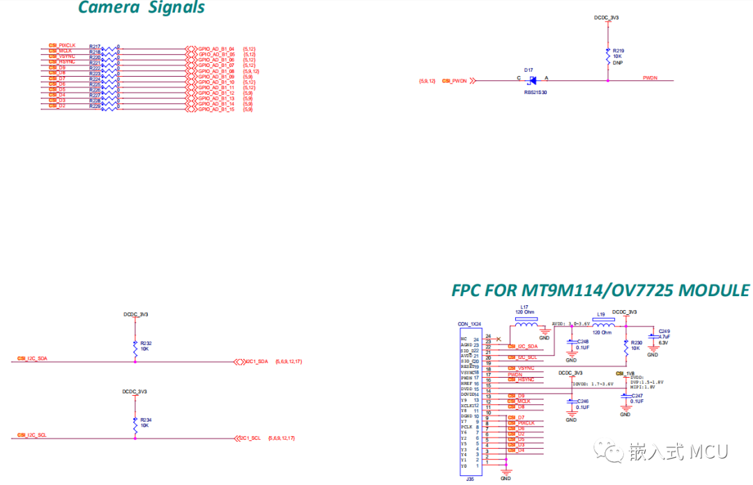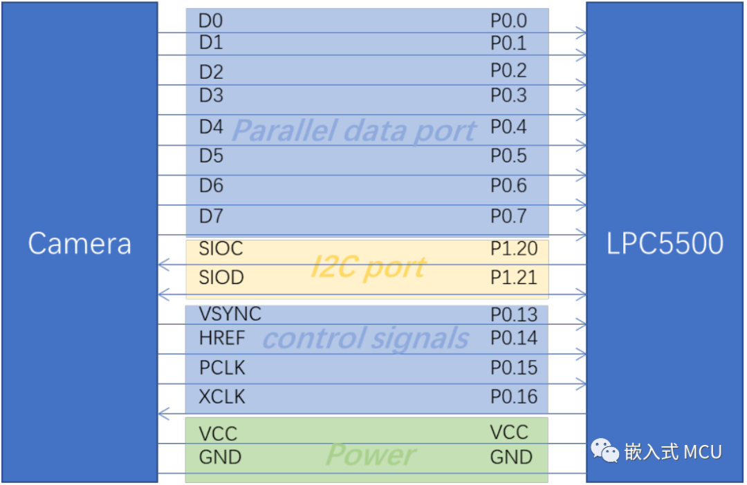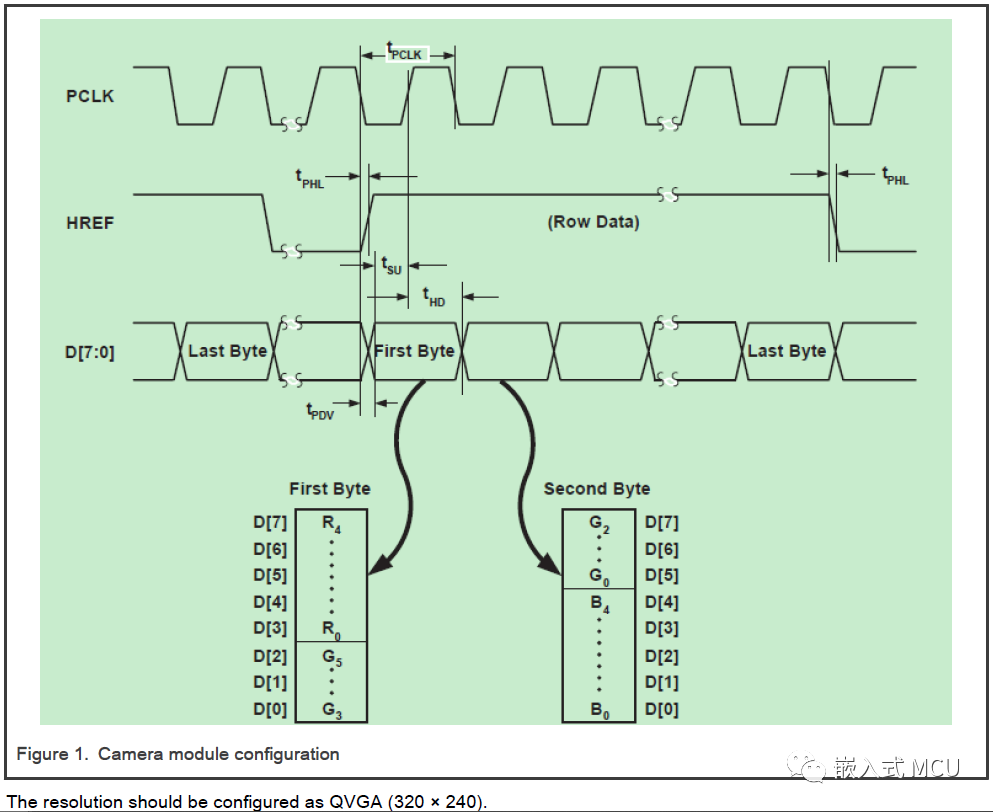 可以通过MCU输出CLKOUT信号 50MHz的时钟给到摄像头模块。I2C接口配置直接连接MCU的I2C外设。320x240解析度的图片需要 150K字节的RAM空间。