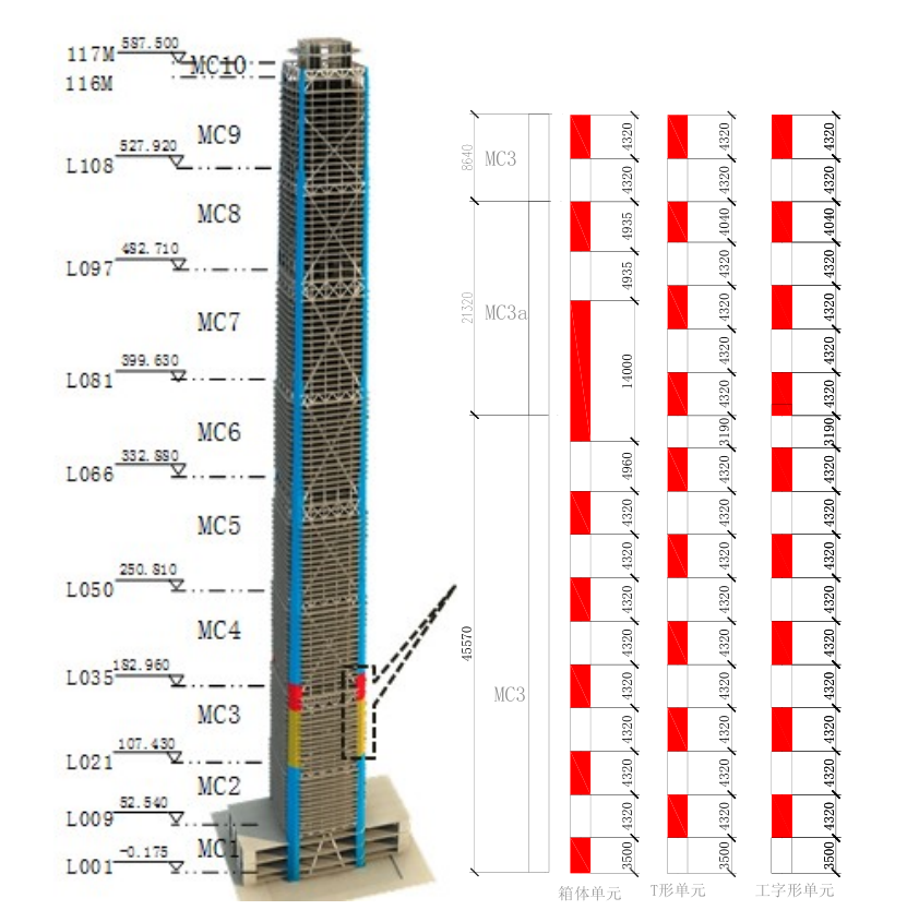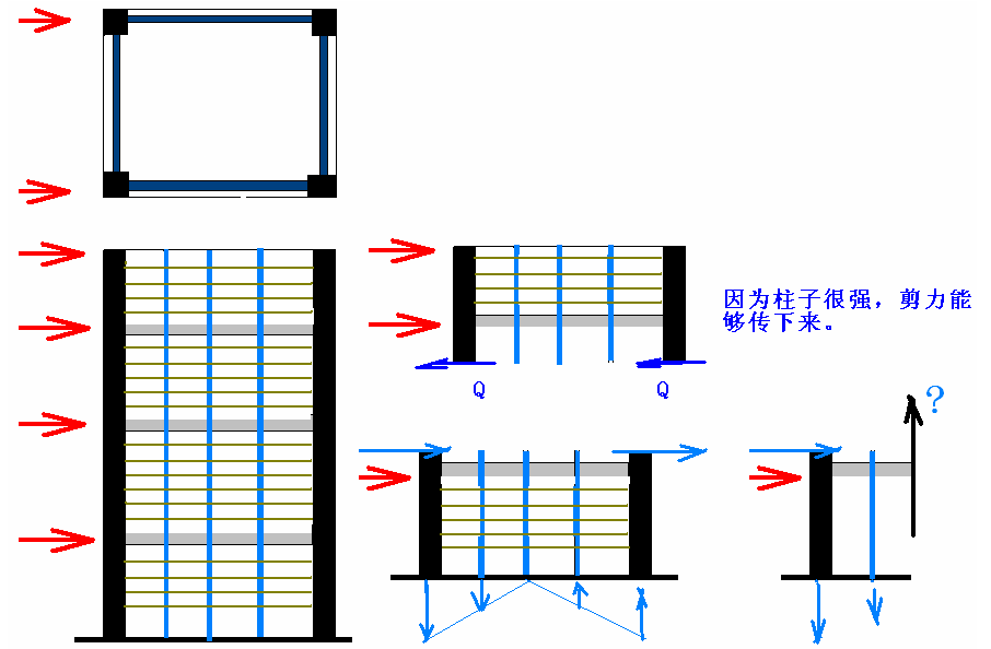很大且约束很强,能分配到更多剪力,另一方面承受更多"弯曲正应力",从而充分利用材料性能,而其余柱子尺寸稍小(这些柱子所受的正应力较小)。这样既美观实用又节约材料。