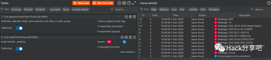 注:扫描结束后才会在BurpSuite的Target、Dashboard模块显示高危漏洞,进程扫描中无法进行同步,但可以在插件中查看(涉及到DoPassive方法问题)。