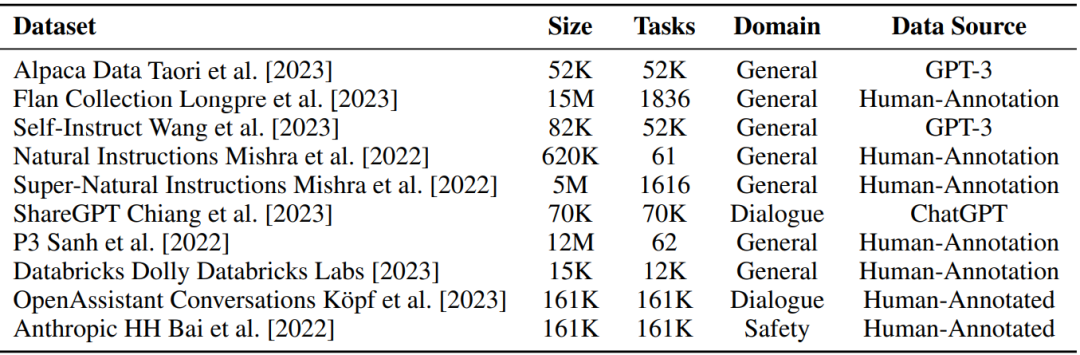 「指令数据集」 指令模型的核心是应用指令数据来对基础LLM进行训练。数据质量、数据数量、数据的多样性和格式都可以决定指示模型的行为。下表为作者收集的几个开源指令数据集的详细信息。