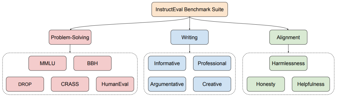 为了能够对指令LLMs进行全面的评估,作者引入了一个专用于LLMs的评估套件,称为 INSTRUCTEVAL。为了涵盖模型的通用能力,在问题解决、文字写作、价值对齐等三个方面对模型进行全面评估,在任务设置方面,INSTRUCTEVAL既有可以客观评分的任务,也有需要定性评判的任务,如下图所示: