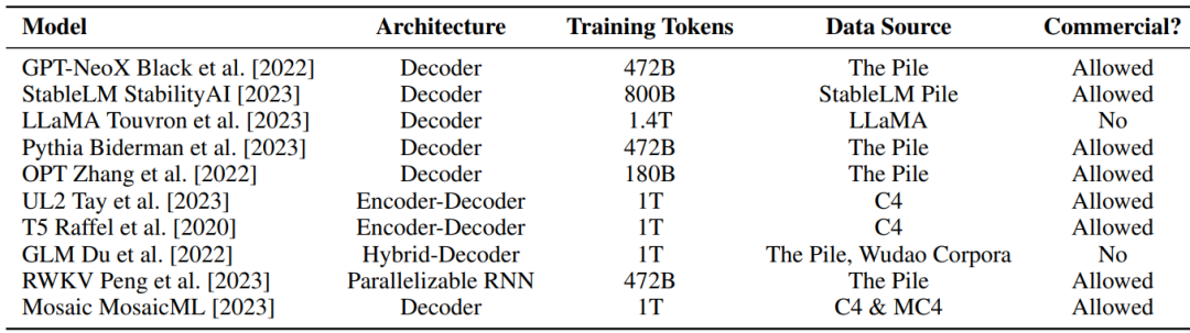 「基础模型」 今年大型语言模型(LLMs)引起广泛的关注,目前「它已经成为一个非常广泛的概念,并没有一个明确的定义」。例如:大型语言模型可以指预训练模型、指令模型(如 GPT-4),甚至是与LLMs松耦合的应用程序。因此作者在这里主要关注开源的指令大型语言模型。下表为LLM基础模型的详细信息。