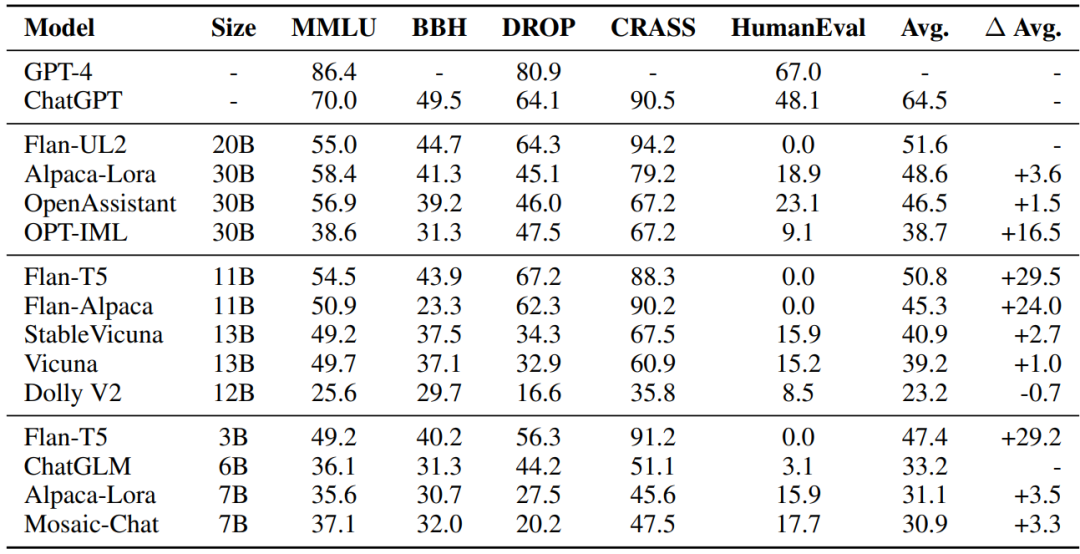 下表展示了指令LLMs在「问题解决能力上的评估结果」。作者对十多个开源模型进行评估,整体来说受指令引导的LLM与其各自的基础模型相比,解决问题能力有了很大的提升。