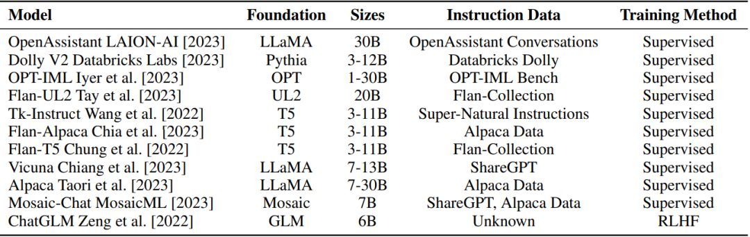 「开源指令LLMs」 在考虑了支持指令LLMs的预训练基础模型和数据收集后,作者整理基础模型、模型大小、指令数据集和每个指令LLM使用的训练方法。具体如下图所示: