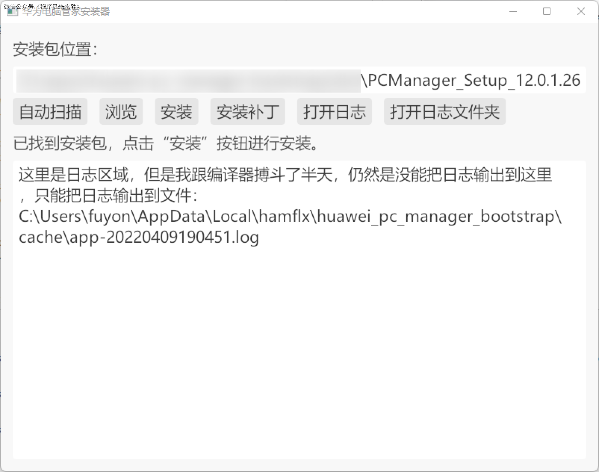 打开安装器后,点击“自动扫描”按钮,安装器会查找所在目录的华为电脑管家安装包。如果找到安装包,会自动将安装包路径填写到上方的输入框中。如果未能自动找到安装包,应点击“浏览”选择安装包,或手动输入绝对路径。