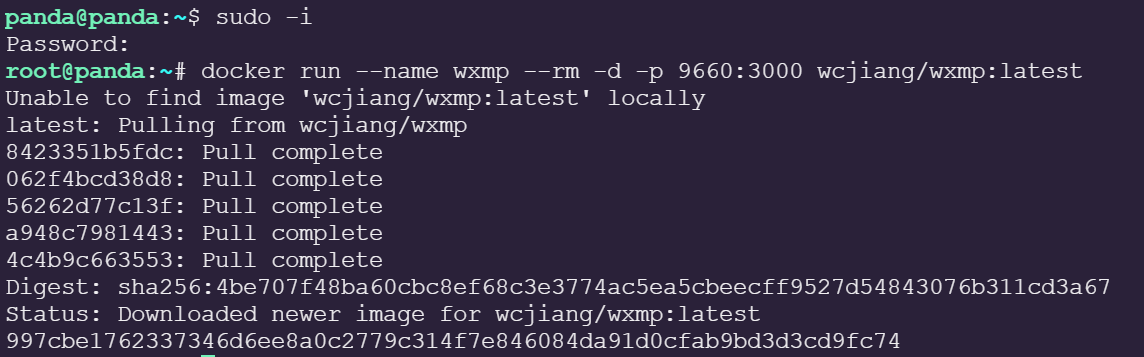 熊猫这里采用群晖部署,并且使用的为docker run的方式部署。通过打开群晖的ssh端口,并用ssh工具连接后获取管理员权限,输入命令:docker run --name wxmp --rm -d -p 9660:3000 wcjiang/wxmp:latest便可以实现项目启动了。