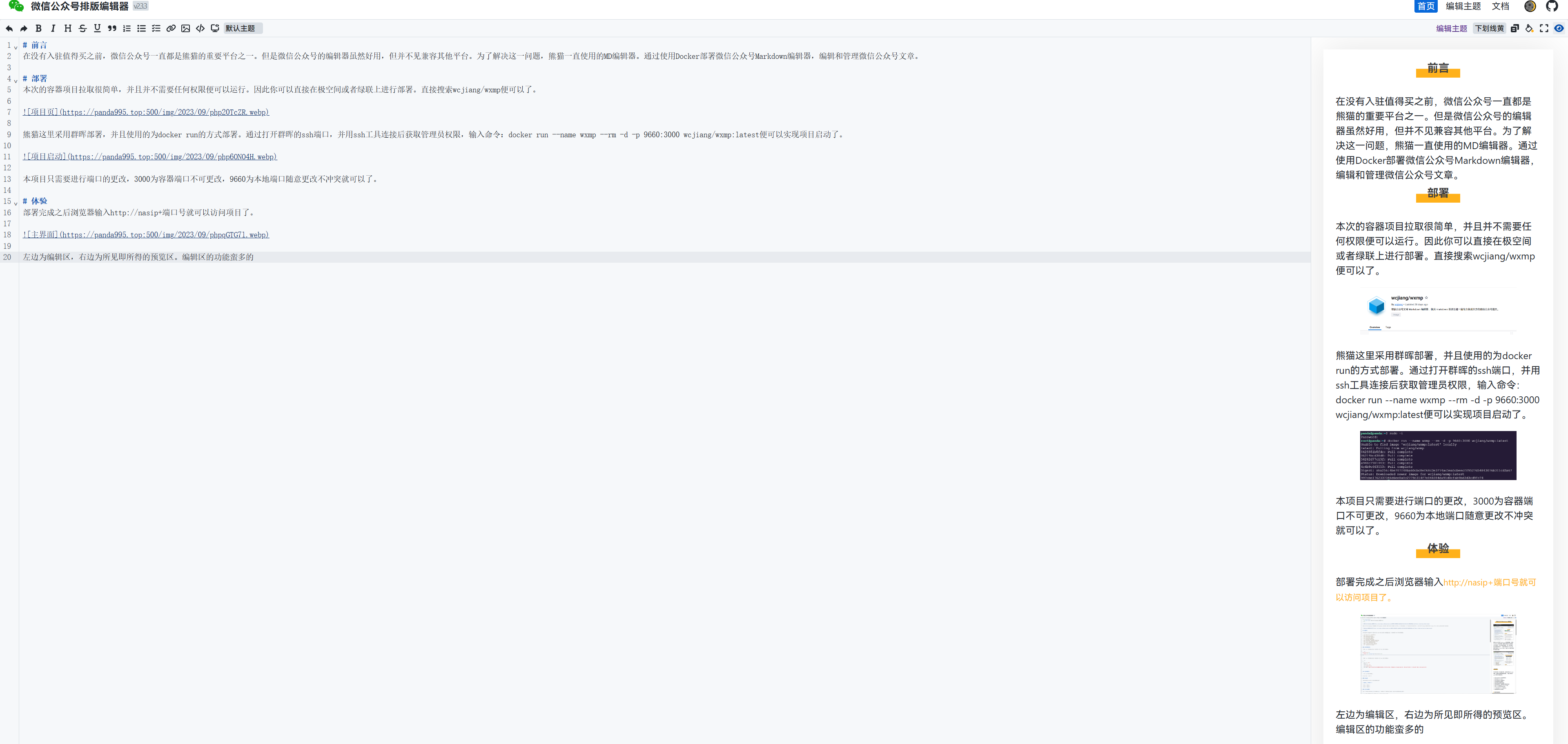 在没有入驻值得买之前,微信公众号一直都是熊猫的重要平台之一。但是微信公众号的编辑器虽然好用,但并不见兼容其他平台。为了解决这一问题,熊猫一直使用的MD编辑器。通过使用Docker部署微信公众号Markdown编辑器,编辑和管理微信公众号文章。