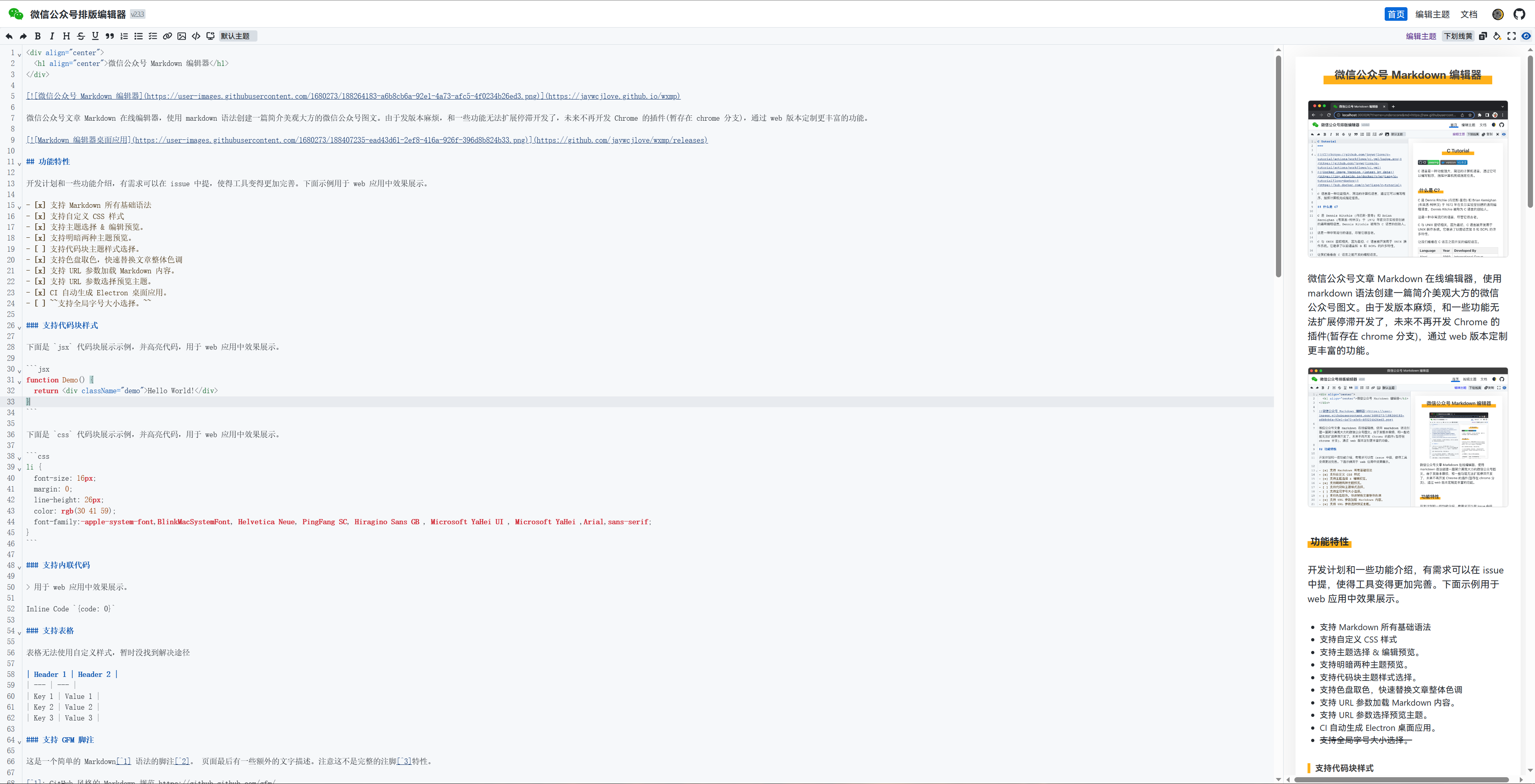左边为编辑区,右边为所见即所得的预览区。编辑区的功能蛮多的常用的都有,而预览区则是可以实时预览你编辑的内容,且可以通过css来设置不同样式。
