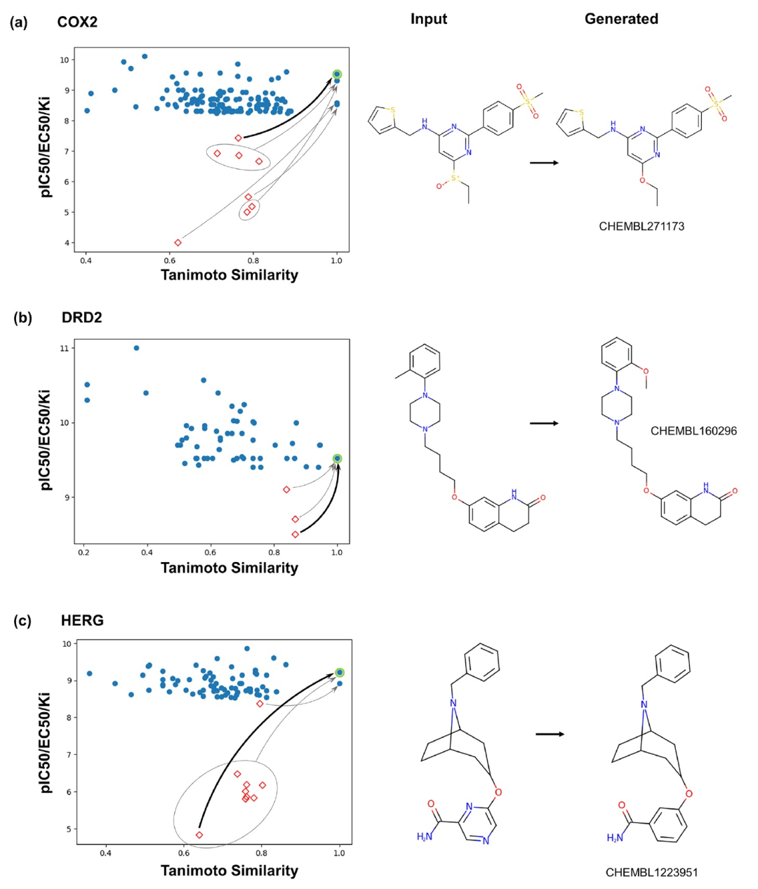 为了说明活性变化的程度,作者在散点图中添加了关于用于预测输出分子的输入分子的信息,这些输入分子与测试集中的某个分子完全重合(图3中的红色菱形;为避免图表过于拥挤,未显示其他所有的输入分子)。输入分子和输出分子之间的配对关系用箭头表示(一些输入分子会生成相同的输出分子)。对于所有三个蛋白靶点,从高纳摩尔级活性的配体中预测出亚纳摩尔级活性的配体(在HERG的情况下,甚至是从高微摩尔级活性的配体中预测出)。