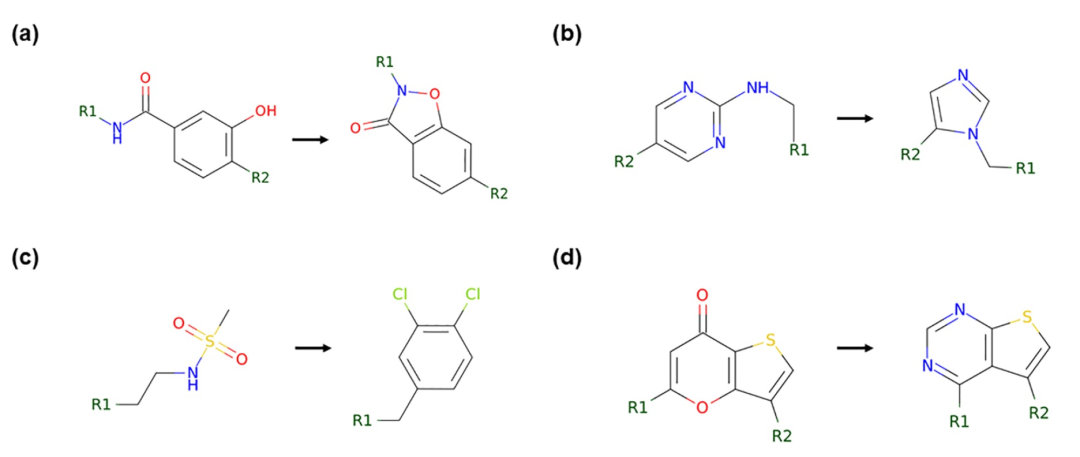 Transformer模型可以为活性扩展生成新颖的分子转化。由于在图3中展示的转化能够生成针对给定蛋白靶点的高活性分子,这些转化可以用传统的匹配分子对(Matched Molecular Pairs,MMP)方法进行识别,作者希望评估所提出的方法超越MMP的能力。因此,作者首先生成了针对在ChEMBL分子的训练子集中的所有MMP转化规则(以SMIRKS的形式表示);预期地,其中最常见的是单个原子(H、F、Cl等)或简单基团(甲基、甲氧基、乙基等)的添加或替换。然后将相同的过程应用于生成由Transformer机器学习模型(经过10个epoch的训练和过滤截断值为50)输出的分子与来自验证子集的输入分子之间的所有合理的SMIRKS。作者发现了1086个SMIRKS,表示Transformer模型发明的非明显的、药物化学水平的分子转化,这些转化不在训练子集中的MMP转化集合中(图4)。在许多情况下,这些新颖的转化可以用领域熟悉的广泛类别解释,例如通过环形成对分子的刚性化(图4a),R基团的置换(图4c),或者在保持关键药效团模式的情况下的杂环替换(图4b和4d)。