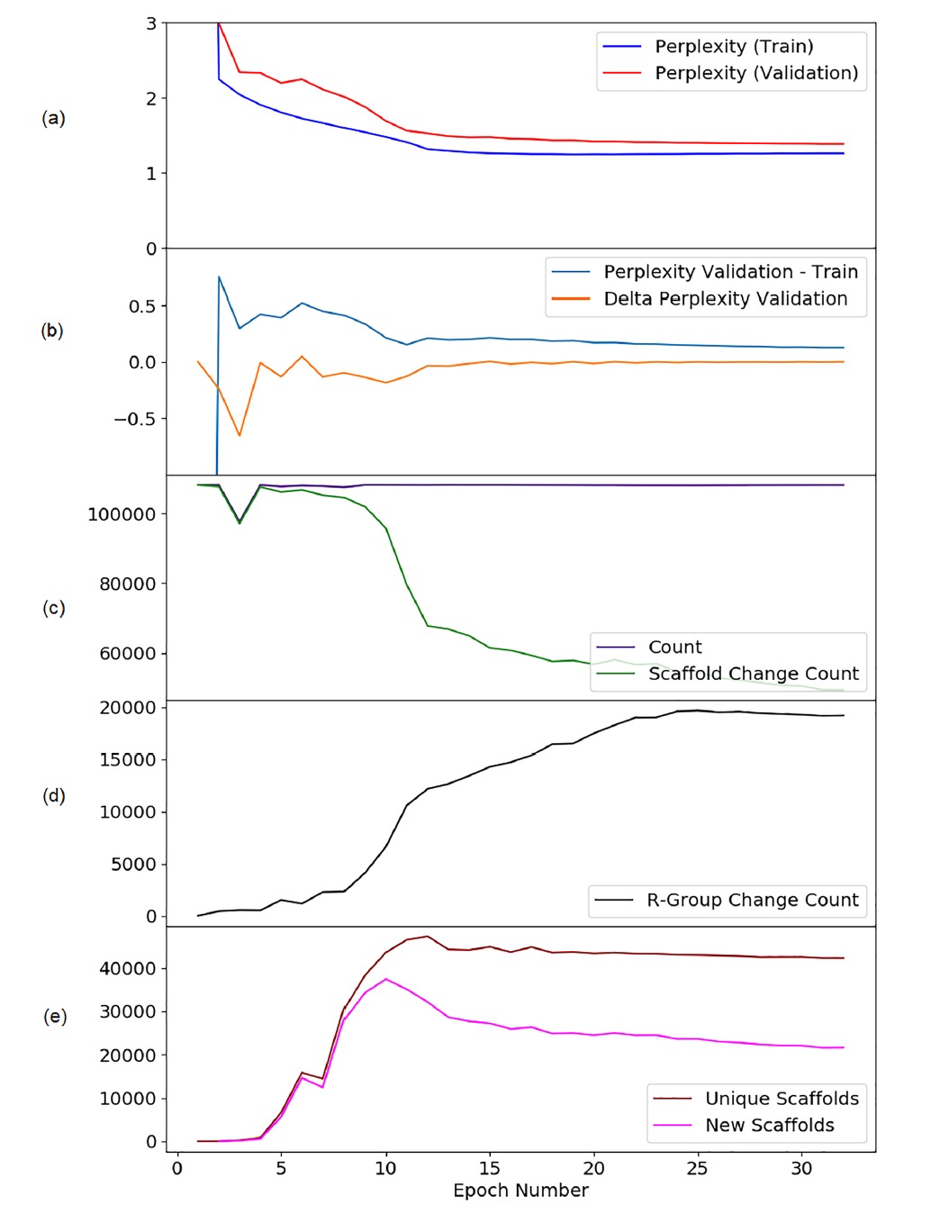 作者首先探讨的问题是在训练过程中,Transformer模型的常见信息理论评分与模型输出的化学评分之间的关系。在这项工作中,作者使用perplexity评分作为前者的代表;对于后者,作者计算了输出中生成的分子的总数、骨架变化转化的数量、R基团变化转化的数量、独特骨架的数量以及输出中的新骨架的数量。从训练perplexity(图2a)可以看出,在经过10到12个epoch后应该停止训练。为了方便观察,作者还绘制了当前epoch验证集和训练集困惑度之间的差异(图2b,“Perplexity Validation−Train”),以及当前和先前训练epoch中验证集perplexity的差异(图2b,“Delta Perplexity Validation”)。显然,经过10到12个epoch后,验证Perplexity稳定下来。然而,需要注意的是,这里不适用早停准则,因为即使在第32个epoch附近,验证Perplexity仍然非常缓慢地下降,使用这个准则即使在这样晚的阶段也不会停止训练。